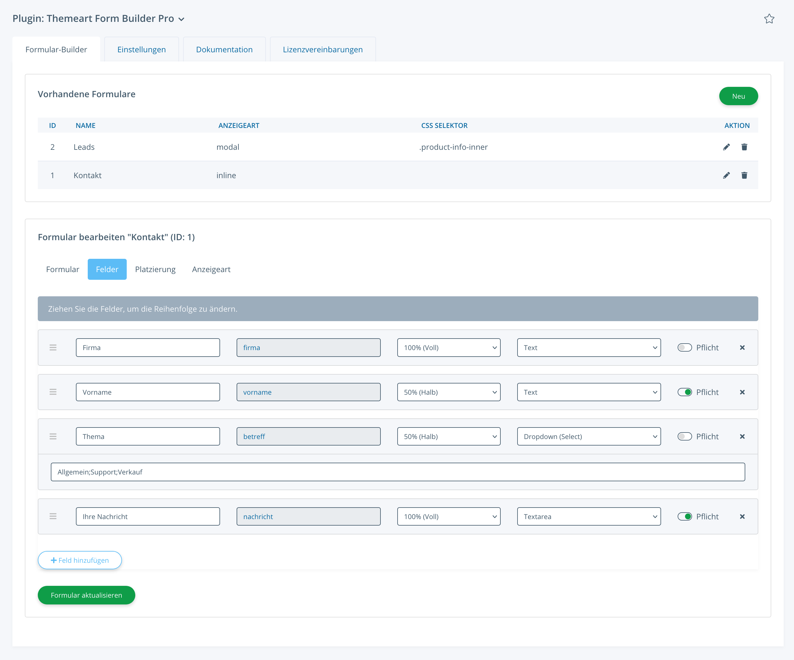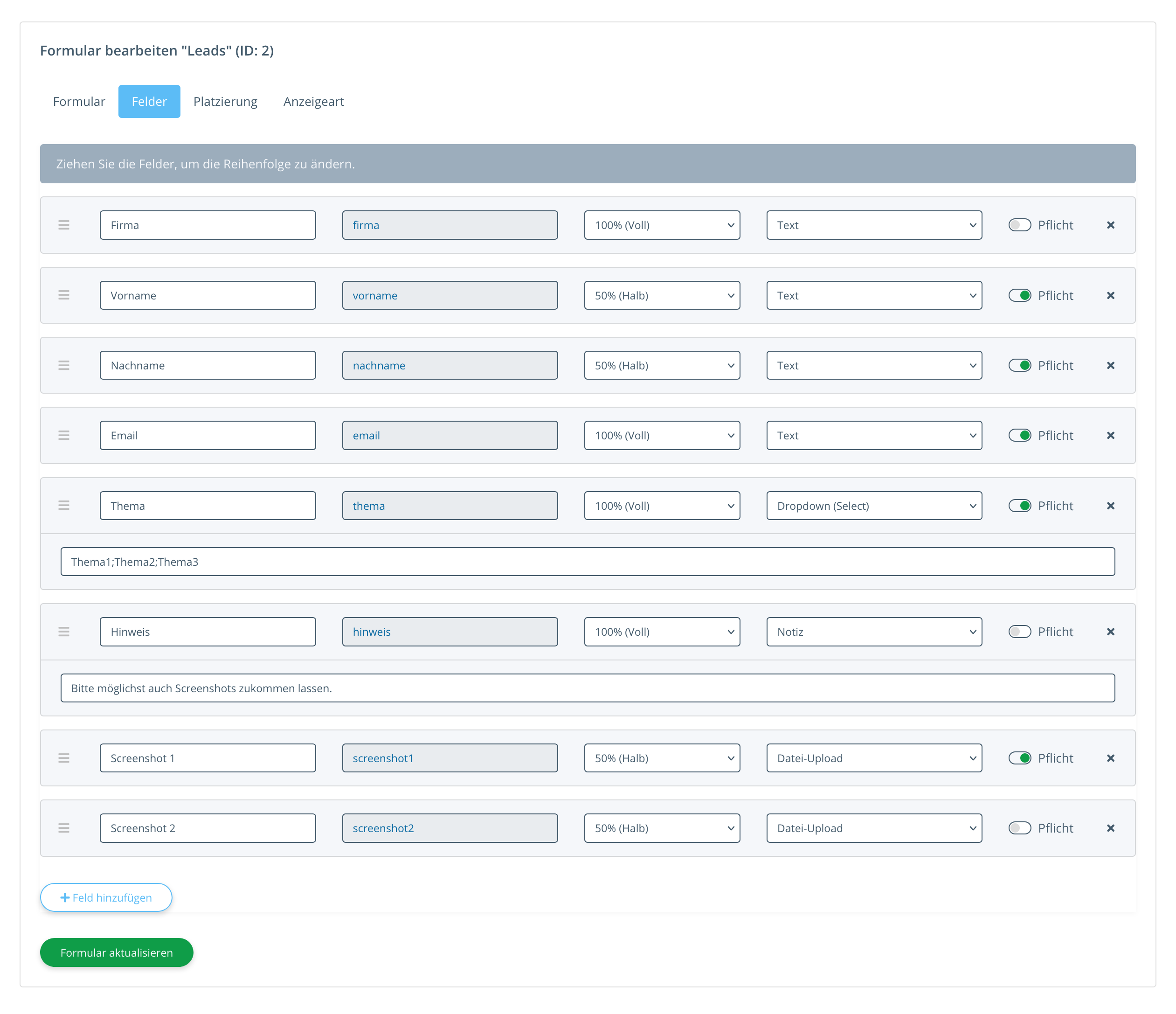 - Über 13 integrierte Feldtypen (Text, Select, Checkbox, Datei-Upload u.v.m.)